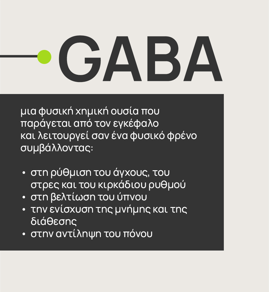 Στην πραγματικότητα το GABA είναι ένα μόριο που επηρεάζει βαθιά το πώς αισθανόμαστε, πώς διαχειριζόμαστε το στρες και πώς ρυθμίζουμε τη διάθεσή μας, έχοντας την ικανότητα να «μειώνει» την ένταση μεταξύ των νευρώνων, εμποδίζοντας την υπερδιέγερσή τους. Όταν βιώνουμε άγχος, παράγονται ορμόνες που προκαλούν διάφορες αντιδράσεις, όπως η επιτάχυνση του καρδιακού παλμού ή η έκρηξη αδρεναλίνης. Το GABA εξουδετερώνει αυτά τα φυσικά διεγερτικά χαλαρώνοντας τον εγκέφαλο. Με απλά λόγια, το GABA λειτουργεί σαν ένα φυσικό φρένο στον εγκέφαλο, συμβάλλοντας: