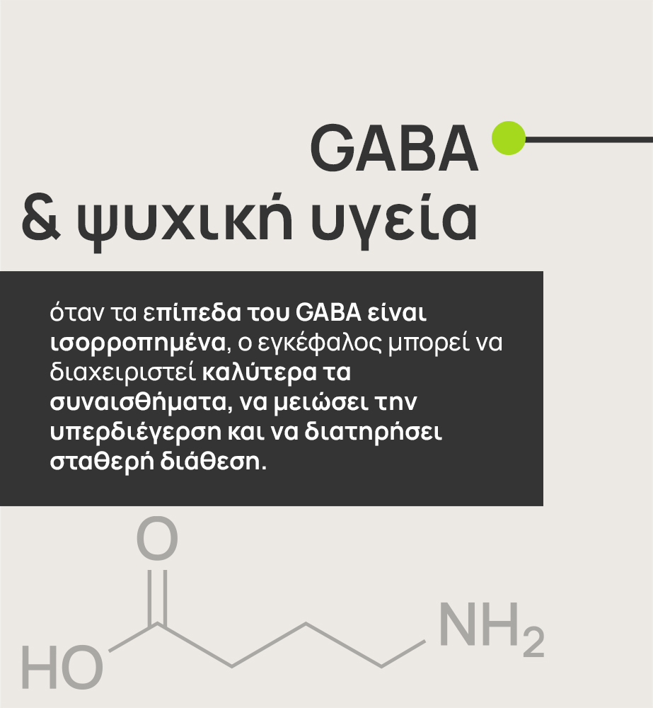 Η σχέση μεταξύ GABA και ψυχικής υγείας έχει μελετηθεί εκτενώς τα τελευταία χρόνια. Έρευνες δείχνουν ότι χαμηλά επίπεδα GABA στον εγκέφαλο σχετίζονται με αυξημένο άγχος, νευρικότητα και καταθλιπτική διάθεση. Όταν η GABAεργική δραστηριότητα μειώνεται, το νευρικό σύστημα δυσκολεύεται να ηρεμήσει, με αποτέλεσμα να εμφανίζονται συμπτώματα όπως έντονη ανησυχία, ευερεθιστότητα και δυσκολία ύπνου. Αντίθετα, όταν τα επίπεδα του GABA είναι ισορροπημένα, ο εγκέφαλος μπορεί να διαχειριστεί καλύτερα τα συναισθήματα, να μειώσει την υπερδιέγερση και να διατηρήσει σταθερή διάθεση.