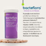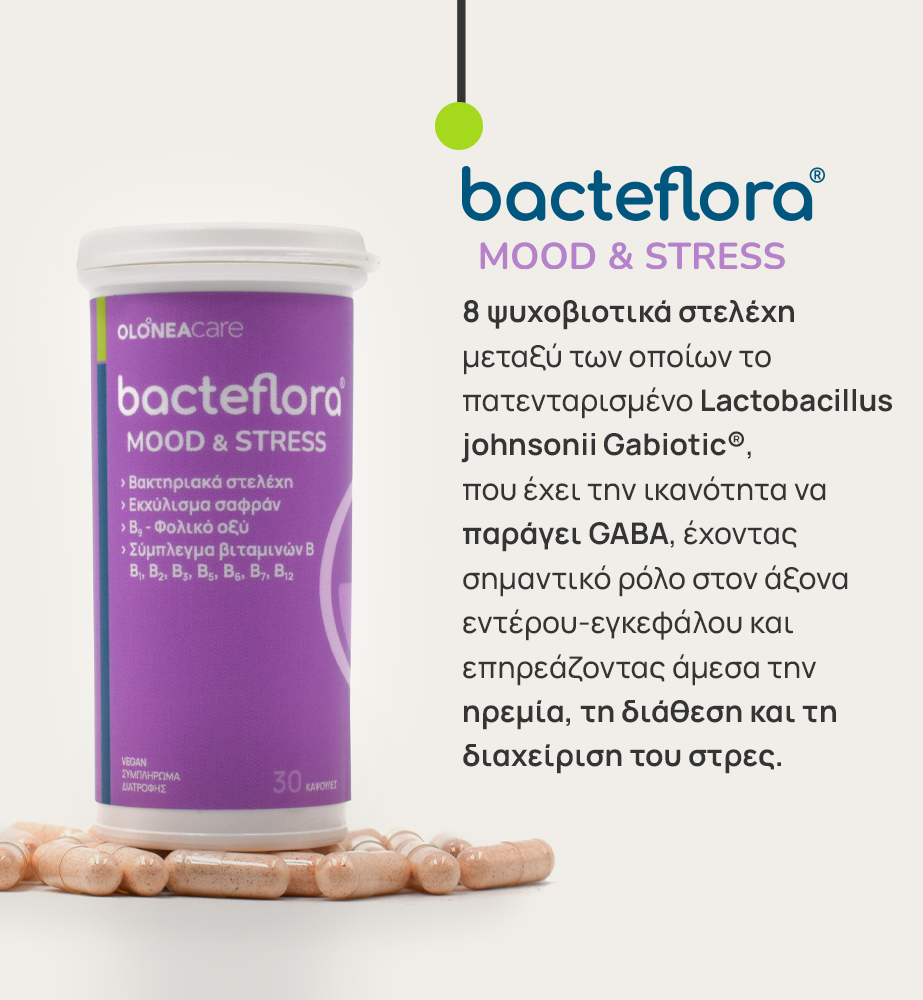 Οι φυσικές πηγές προβιοτικών και τα εξειδικευμένα συμπληρώματα διατροφής όπως το Bacteflora Mood & Stress υποστηρίζουν τα GABA-παραγωγικά βακτήρια του εντέρου. Ειδικότερα, το Bacteflora Mood & Stress περιέχει 8 ψυχοβιοτικά στελέχη μεταξύ των οποίων το πατενταρισμένο Lactobacillus johnsonii Gabiotic®. Το συγκεκριμένο προβιοτικό στέλεχος έχει κατοχυρωθεί για την εξαιρετική του ικανότητα να παράγει GABA, παίζοντας σημαντικό ρόλο στη λειτουργία του άξονα εντέρου-εγκεφάλου και επηρεάζοντας άμεσα την ηρεμία, τη διάθεση και τη διαχείριση του στρες. Το Bacteflora Mood & Stress περιέχει επίσης ειδικά επιλεγμένα μεταβιοτικά στελέχη, με αποδεδειγμένη επίδραση στη μείωση του ψυχολογικού στρες, τη φλεγμονή, το οξειδωτικό στρες και τις πρωτεΐνες σύνδεσης το επιθηλιακού φραγμού. Το εκχύλισμα σαφράν Affron® και οι βιταμίνες του συμπλέγματος Β ολοκληρώνουν την σύνθεση του Bacteflora Mood & Stress για συναισθηματική ισορροπία, καλύτερη διάθεση και λιγότερο stress.